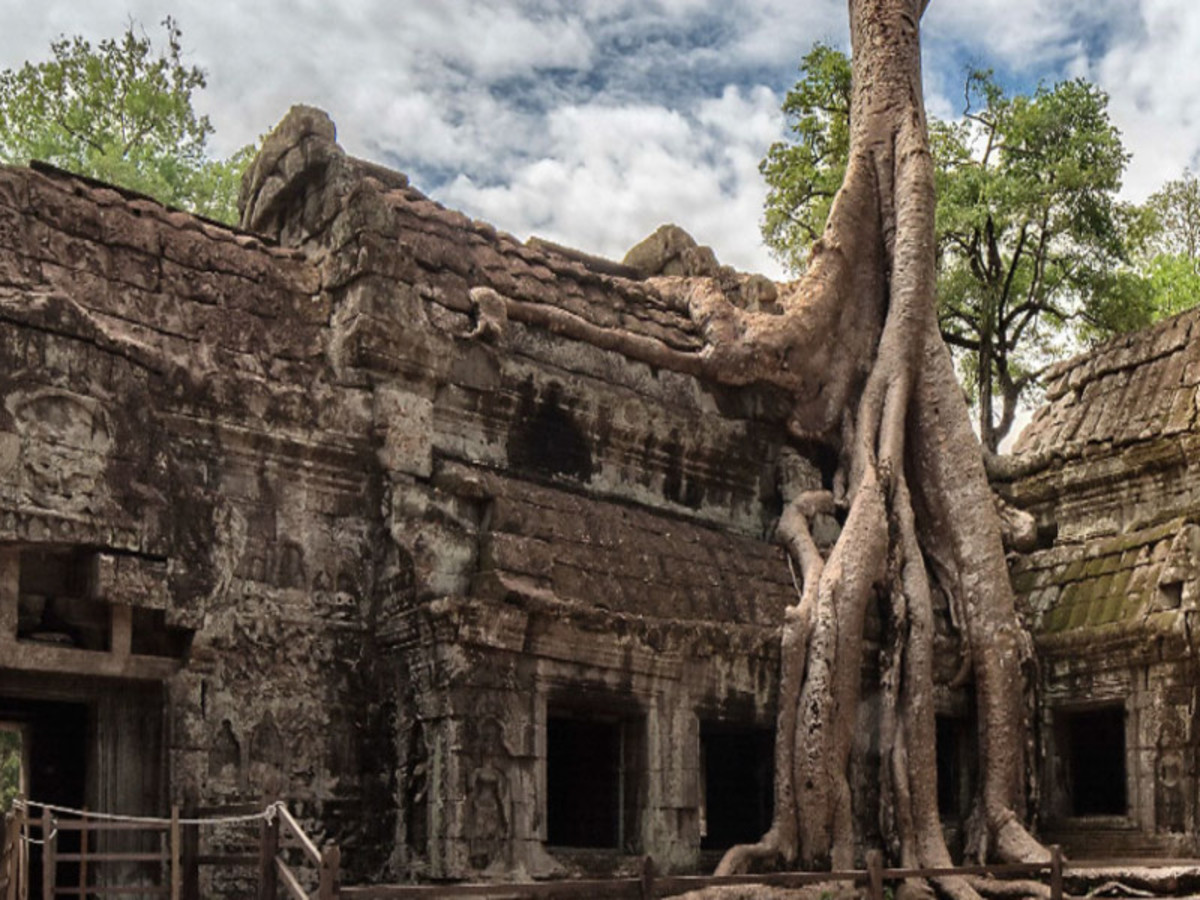 composé de 54 gigantesques tours comportant 216 visages d'Avalokitesvara. Puis vous découvrirez le temple pyramidal de Baphuon du XIe siècle, dédié au brahmanisme, et représentant le mont Méru. Ensuite, la Terrasse des Eléphants, longue de 350 mètres, qui accueillait le faste des audiences royales et des cérémonies publiques ; puis la terrasse du Roi Lépreux, plate-forme du XIIe siècle qui présente plusieurs admirables figures sculptées des Apsaras. Nous continuons à visiter le fabuleux Ta Prohm embrassé par les racines des arbres énormes et des lianes gigantesques. Ensuite, vous visitez le temple de Preah Khan, un sanctuaire mystique construit par le roi Jayavarman VII en hommage à son père. Laissez-vous envoûter par le dédale de portes et les sculptures délicates. Tout près de là, et datant du même siècle, vous trouverez Neak Poan, un temple angkorien unique situé au sommet d'une île. Il représente, dit-on, Anavatapta, un lac mythique et sacré de l'Himalaya, vénéré par la population hindoue pour les pouvoirs de guérison de son eau. Poursuivez votre voyage en vous arrêtant à Ta Som, un petit temple photogénique puis à East Mebon, un ancien "temple-île" situé au milieu du Baray oriental, aujourd'hui asséché. Vous admirerez le temple-montagne bien préservé de Pre Rub avant de vous rendre à Srah Srang, le réservoir d'eau royal, pour le coucher du soleil. Repas libres. Nuit à Siem Reap