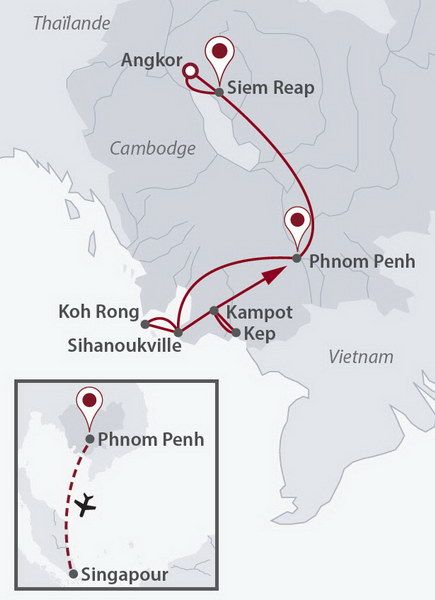 - Les excursions et visites mentionnées avec guide accompagnateur local francophone de Siem Reap à Phnom Penh (sauf jour 8 et 9 au Cambodge et jours 13 et 14 à Singapour)