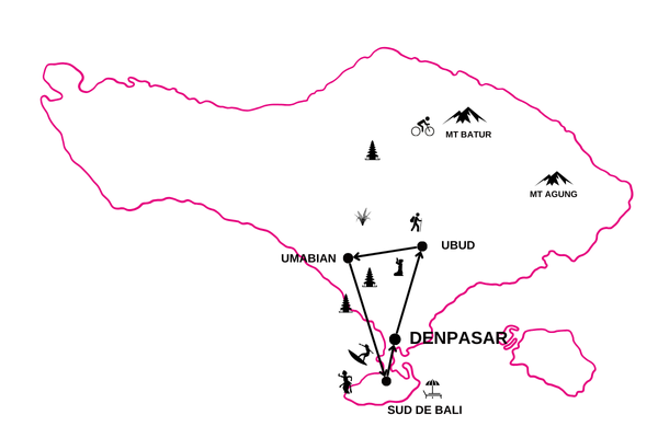 * La première et/ou la dernière nuit de séjour plage sur l'une des îles à proximité de Bali (Nusa Lembongan, Nusa Penida, Gili, Lombok, etc.) pourra s'effectuer à Bali au lieu de l'île prévue en raison d'horaires de vols ne permettant pas pas d'effectuer votre transfert par bateau vers l'île ou l'aéroport le jour même de votre vol.