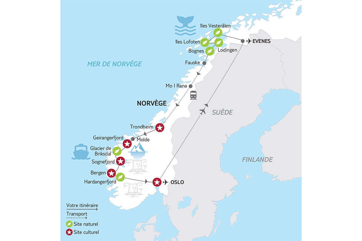 Depuis Oslo, cap vers le nord de la Norvège. Découvrez la myriade d'îles et d'îlots des Vesterålen et des Lofoten avec leurs cabanes de pêcheurs sur pilotis. Après une expédition à la rencontre des baleines, direction le sud en empruntant la route de l'Atlantique puis celle des Trolls, jusqu'aux fjords bordés de pics d'où dégringolent des cascades d'eau et de fleurs...