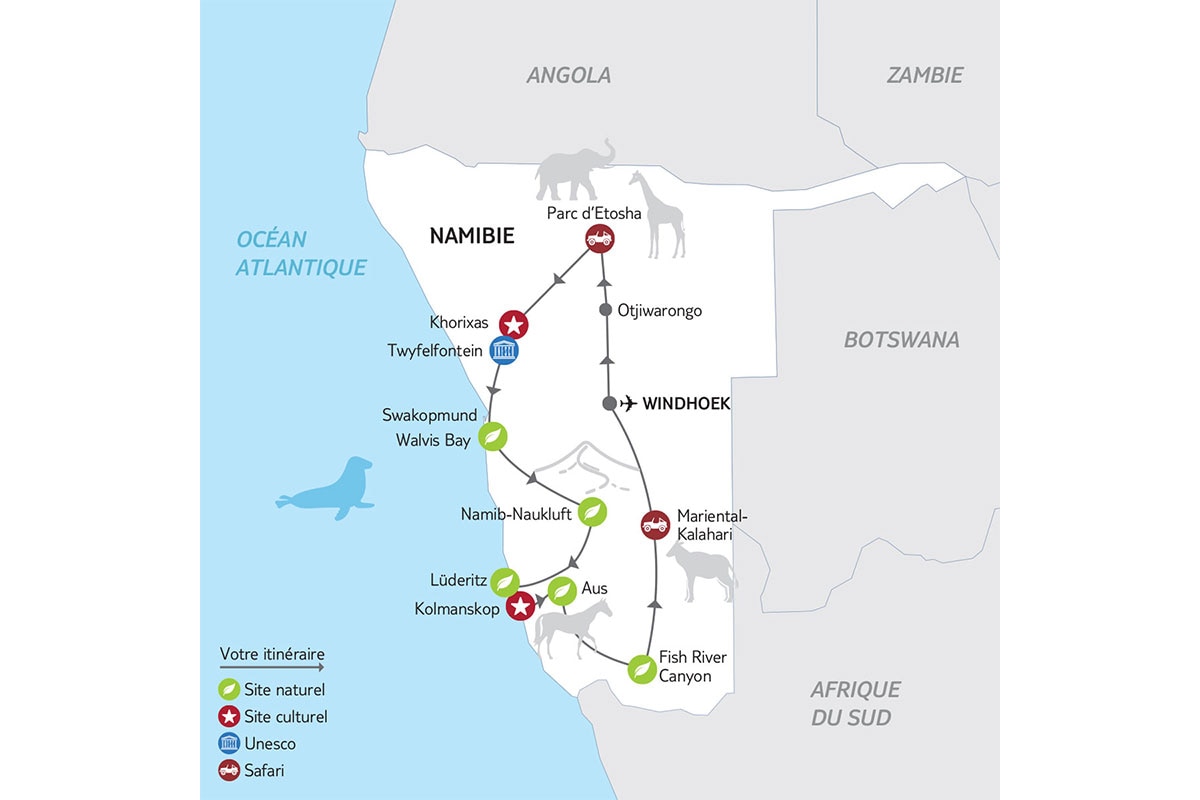 Depuis le 1er avril 2025, un visa est nécessaire pour entrer en Namibie (voir formalités Namibie). Pour ce circuit , l'entrée en Namibie se fait par l' Aéroport HOSEA KUTAKA WINDHOEK.