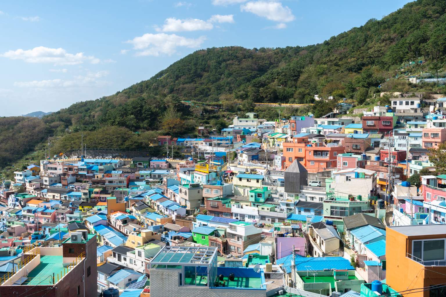 Flânez dans le village artistique de Gamcheon, réputé pour ses maisons colorées et ses œuvres d'art urbain.