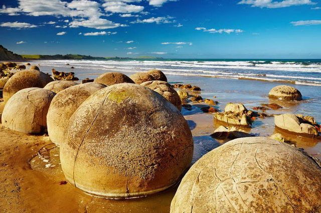 Traversée de l’île par les terres. Arrêt sur la plage de Koekohe, célèbre pour ses Moeraki Boulders, grandes pierres sphériques sculptées par l’érosion. Continuation le long du lac Pukaki d’où vous pourrez voir (si le temps le permet) le Mt Cook, le point culminant de la Nouvelle-Zélande (3 755 m). (P.déj+Déj+Dîn)
