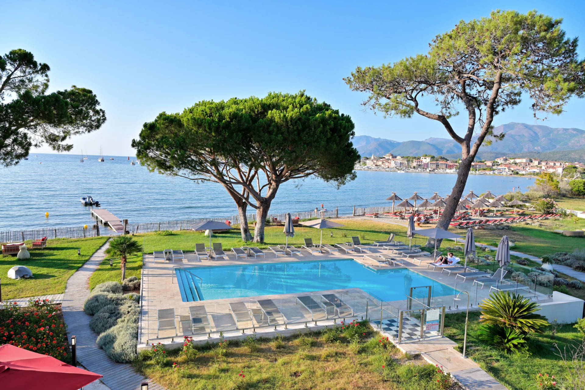 Laissez-vous séduire par la piscine extérieure chauffée toute la saison dominant la mer et bordée de chaises longues et de parasols.