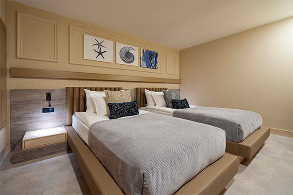 - Chambre Familiale (55 m²) : mêmes équipements, 2 chambres communicantes (1 lit double et 2 lits simples), 2 minibars, balcon vue jardin, Capacité maximum : 4 adultes.
