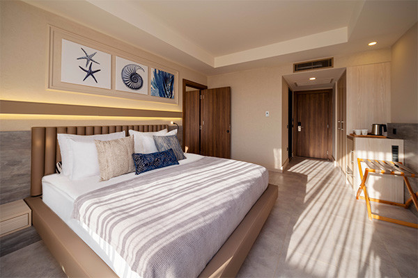 - Suite Breeze (45 m²) : Chambre avec 1 lit double, 1 canapé-lit, baignoire, machine à café, planche à repasser et balcon avec vue sur la mer. Capacité maximum : 2 adultes + 1 enfant.