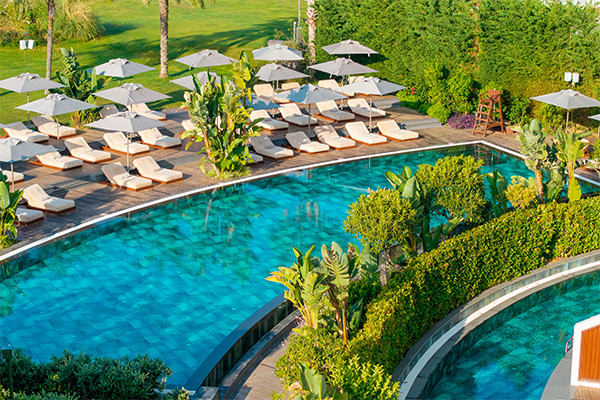 - Chambre Deluxe vue sur la piscine (25 m²) : mêmes équipements, balcon avec vue sur la piscine. Capacité maximum : 3 adultes.