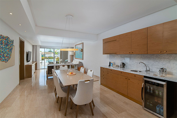 - Master Suite avec accès piscine (158 m²) : 1 chambre avec lit king size, salle de bain avec douche et baignoire, salon avec salle à manger, bar et coin salon avec canapé-lit, terrasse avec accès direct à la piscine. Capacité maximum : 5 personnes.