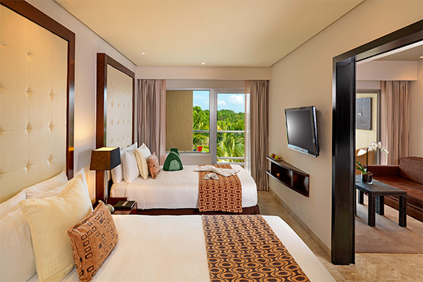 - Master Suite 2 chambres vue nature (184 m²) : 2 chambres (1 avec lit King size et l'autre avec 2 lits doubles), TV dans chaque chambre, 2 salons et salles à manger avec canapé, canapé-lit et TV, balcon ou terrasse avec bain à remous, 2 salles de bain. Capacité maximum : 6 adultes.