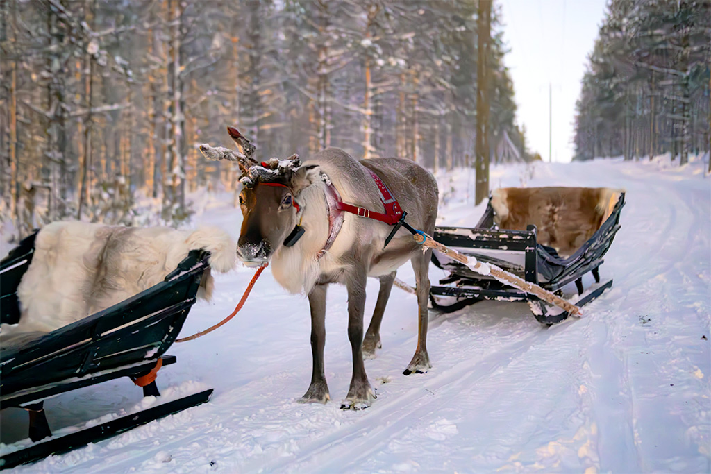 Remise des équipements grands froids que vous garderez toute la semaine. Vous partirez à la rencontre des magnifiques rennes de Finlande. Vous pourrez les nourrir, prendre des photos et peut-être même leur faire un câlin. Par la suite, vous effectuerez une balade sur un parcours de 300 m en renne dans les environs de Suomutunturi, vous permettant de vous initier à ce mode de transport traditionnel et de profiter d’une expérience inoubliable dans le paysage forestier hivernal. Déjeuner libre. Retour à l’hôtel, ou vous pourrez profiter du traditionnel sauna finlandais, de la piscine, des pistes de ski voisines, ou d’une balade pour vous imprégner du charme de cette petite station. Dîner et nuit à l’hôtel.