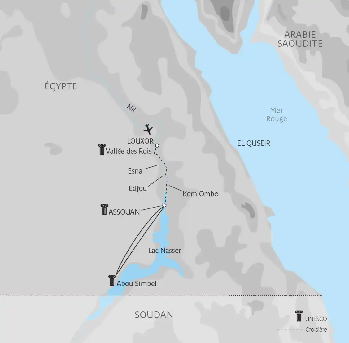Avant l’aube, départ en bus pour les temples d’Abou Simbel (UNESCO). Nés de la volonté de Ramsès II, ces chefs-d’œuvre architecturaux ont été creusés, à l’origine, à même le roc. Pour qu’ils ne soient pas engloutis par la montée des eaux suite à la construction du Haut-Barrage, près de 3 000 personnes travaillèrent 3 ans durant sous l’égide de l’UNESCO pour les découper en d’immenses blocs… et les remonter dans leur orientation initiale 65 m plus haut, accolés à une colline artificielle. Retour à Assouan. Déjeuner à bord. Navigation vers Esna. Dîner et nuit à bord.