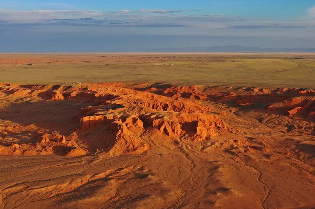 Route pour Bayanzag et ses étonnantes falaises rouges, où le paléontologue Roy Chapman découvrit dans les années 1920 les premiers œufs fossilisés de protocératops. Déjeuner pique-nique puis balade dans la forêt de saxaouls, arbustes endémiques résistant à la sécheresse et qui ralentissent la désertification. Installation au campement et rencontre avec une famille de nomades avant le dîner et la nuit sous la yourte. (P.déj+Déj+Dîn)