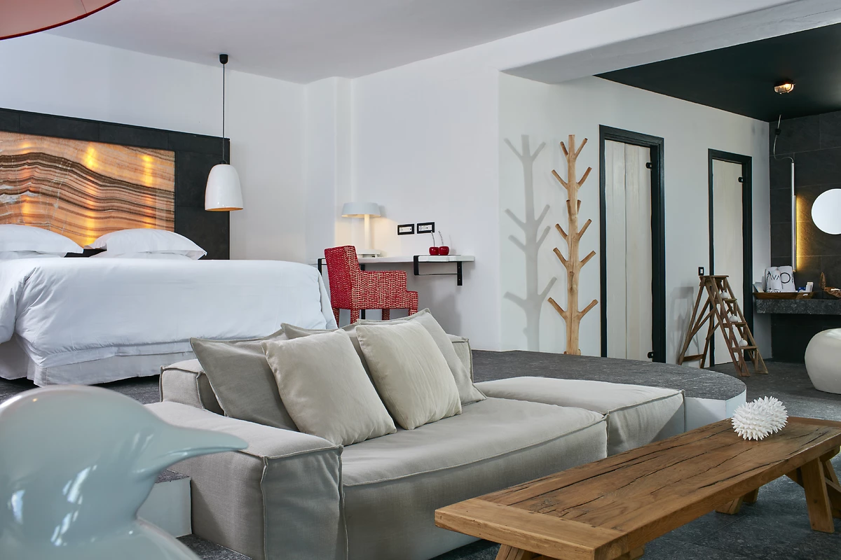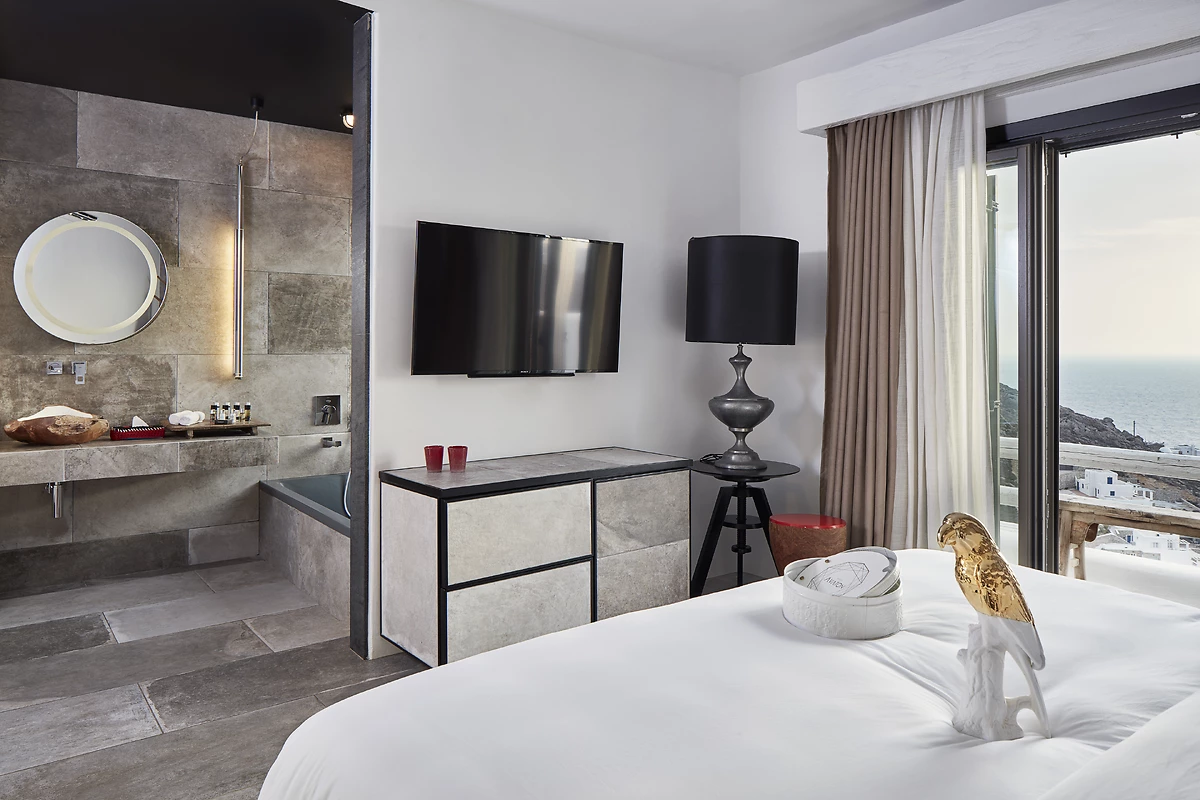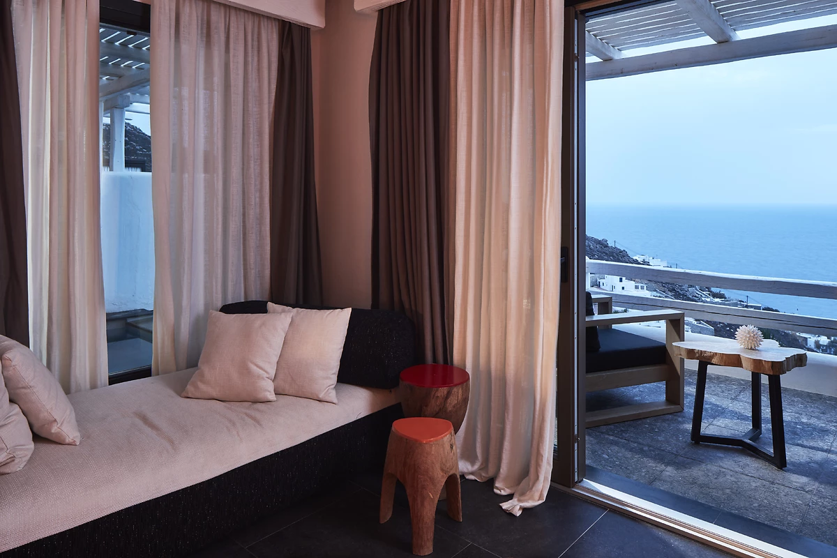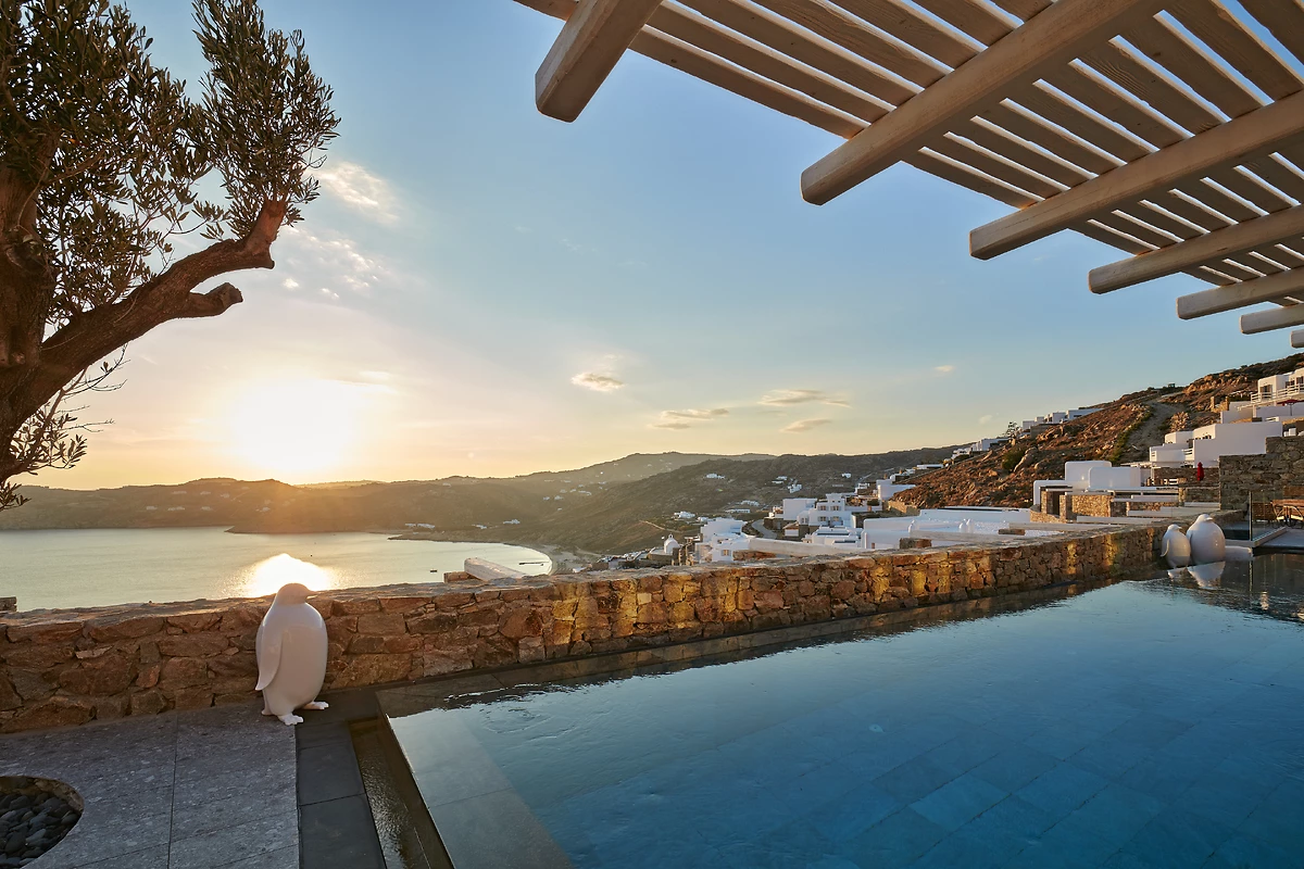 Restaurant Panorama proposant une cuisine aux saveurs locales et donnant sur la mer. Vous aurez l'opportunité de déguster les créations sophistiquées du chef grec Christos Nikolakopoulos. Le Kokkino Bar se trouve près de la piscine et s'avère être le plus bel endroit pour contempler Mykonos de nuit.