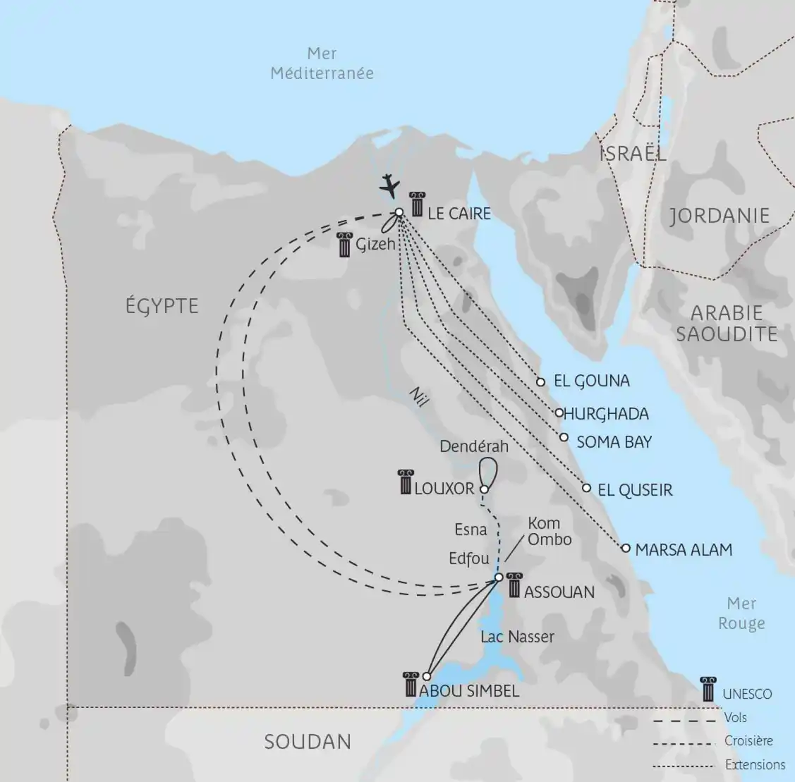 Ses admirateurs - et ils sont nombreux ! - prétendent qu’il faut avoir fait un voyage en Égypte au moins une fois dans sa vie. Comment les contredire tant ce pays est fabuleux. Le moins que l’on puisse dire, c’est qu’à l’heure de se pencher sur ce bout de terre à la pointe de l’Afrique, Iris et Osiris ne se sont pas montrés avares de leurs bienfaits. L’ancien royaume de Cléopâtre est à l'égal de sa reine légendaire : il a tout pour plaire. Avec leurs musées et leurs monuments, Alexandrie et Le Caire, ses deux grandes cités, sont incontournables. Paradis des plongeurs, la Mer rouge offre l’une des plus belles vues sous-marines au monde. Au départ d’Assouan, le Nil se prête à la plus douce des croisières. Et puis, bien sûr, il y a les merveilles antiques…