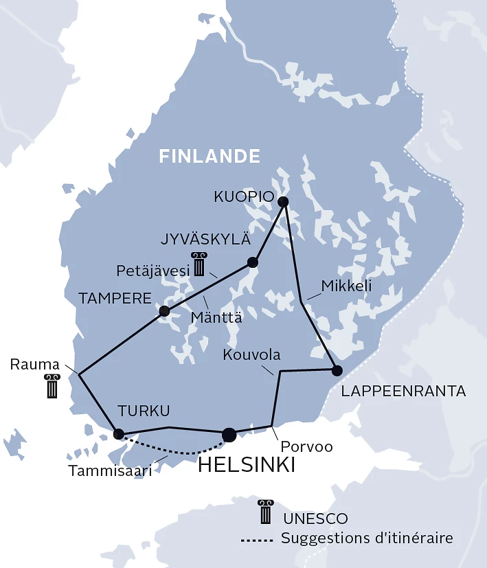 Plusieurs étapes culturelles jalonnent la route pour Jyväskylä : le musée Gösta Serlachius, l’église en bois de Petäjävesi, classée au patrimoine mondial par l’UNESCO, le musée dédié à Alvar Aalto et celui en plein air de Savutuvan Apaja. Nuit dans la région de Jyväskylä.