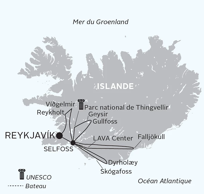 Route vers le Cercle d’Or, en commençant la journée par la découverte de Thingvellir. Ancien siège de l’Althing, premier parlement islandais, c’est aussi dans ce parc national que vous pourrez observer la faille entre les plaques tectoniques eurasienne et nord-américaine. Déjeuner en cours de route. Poursuite vers le site de Geysir pour contempler la source de Strokkur. La découverte du Cercle d’Or se termine par Gullfoss, une des chutes les plus grandioses du pays. Cette chute en deux étages impressionnante peut s’accompagner d’un arc-en-ciel si les conditions le permettent. Pour finir la journée en beauté, détendez-vous dans les eaux chaudes du Secret Lagoon. Dîner libre. Nuit à l’hôtel.